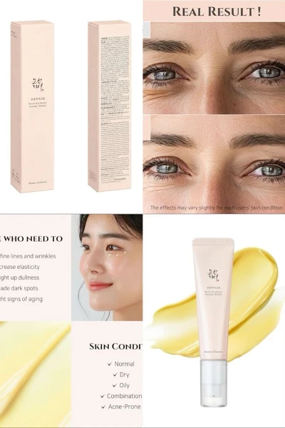 سرم دور چشم بیوتی آف جوسان Eye cream beauty of joseon این محصول جوانساز و ضد چروک حاوی رتینالِ که 11 برابر بیشتر از رتینول موثره و با تحریک کمتر و کارایی بالاتر تا حد زیادی به کاهش چین و چروکها و خطوط اطراف چشم کمک کرده و باعث افزایش خاصیت ارتجاعی میشود همچنین عصاره جینسنگ موجود دور چشم حاوی ساپونینِ که به سرعت رطوبت مورد نیاز پوست اطراف چشم را تامین می کند