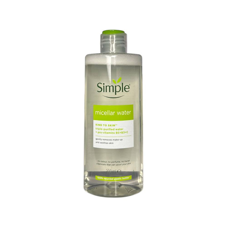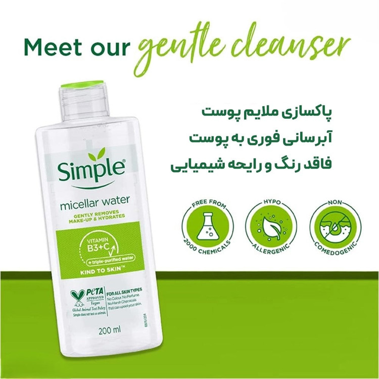 میسلار واتر پاک کننده آرایش و آبرسان از برند سیمپل مناسب برای انواع پوست به ویژه پوست های حساس است.این میسلار واتر فاقد مواد صابونی و با فرمولاسیون بدون تحریک پوست تولید میشود. به این ترتیب با خیال راحت صورت خود را از آلودگی و آرایشهای روزانه پاک کنید. به دلیل عدم نیاز به آبکشی میتوانید در هر جایی که هستید، پوست خود را تمیز و تازه کنید.این میسلارواتر وگان و دارای ترکیبات طبیعی است و مناسب برای پاک کردن آرایش صورت، لب و چشم می باشد و ملایم ترین میسلار واتر این برند می باشد.