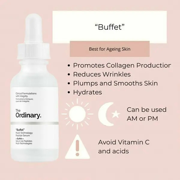 سرم آبرسان و جوانساز بافت (بافه) اوردینری The Ordinary Buffet Serum , multi peptide سرم ضد چروک بافت (بافه) اوردینری با ترکیبی از چندین فناوری موثر ضد پیری، برای مبارزه با چین و چروکهای پوست و تقویت و جوانسازی پوست بافت پوست تولید شده است. محلول مورد استفاده در این محصول غنی از پپتیدها و آمینواسیدهای مفیدی است که بافت پوست را فوق العاده تغذیه میکند. PH یا اسیدیتهی این محصول در بازهی ۴.۵ تا ۵.۵ بوده و اسیدیتهی پوست را به حالت طبیعیاش تنظیم میکند.
