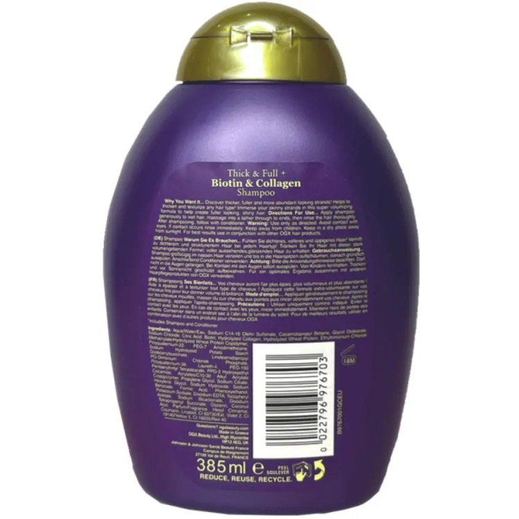 شامپو Biotin & Collagen او جی ایکس تمام آلودگی و ناخالصی های مو و کف سر را تمیز کرده و از بین می برد و بلافاصله پس از استفاده با تغذیه فولیکول های مو سبب افزایش استحکام و نرم و براق و خوش حالت شدن موها می شود . شامپو حجم دهنده او جی ایکس، به حفظ رطوبت موها کمک کرده و باعث خشک شدن آن نمی شود. این شامپو برای انواع مو خصوصا موهای خشک و آسیب دیده، رنگ شده، نازک، ضعیف و کم حجم مناسب است و با استفاده مداوم از این شامپو تک تک تارهای مو ضخیم تر و مقاوم تر شده و سبب پر پشت به نظر رسیدن موها می شود و با رایحه ترنج، یاس و وانیل موها را خوش بو میکند.